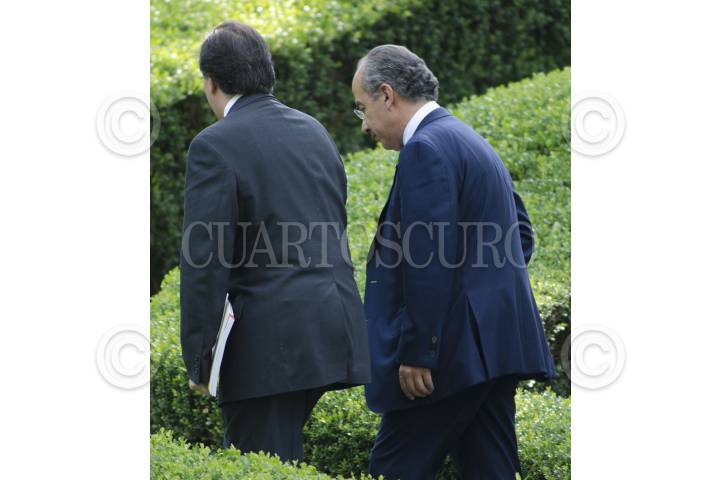 MÉXCO, D.F., 26SEPTIEMBRE2011.- José Antonio Meade, secretario de Hacienda y Crédito Público; Bruno Ferrari, secretario de Economía y Felipe Calderón Hinojosa, presidente de México, dialogan durante su retirada después de haber participado en un almuerzo con motivo del lanzamiento del Fondo Fides y que se realizó en la Hondonada de la Residencia Oficial de Los Pinos. FOTO: MISAEL VALTIERRA/CUARTOSCURO.COM