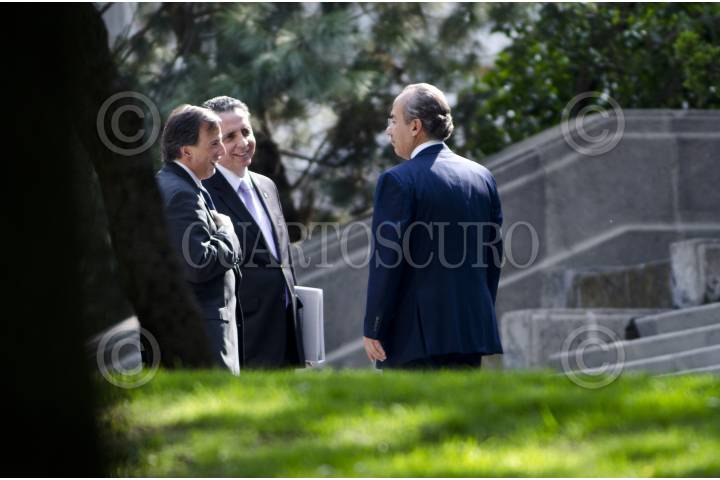 MÉXCO, D.F., 26SEPTIEMBRE2011.- José Antonio Meade, secretario de Hacienda y Crédito Público; Bruno Ferrari, secretario de Economía y Felipe Calderón Hinojosa, presidente de México, dialogan durante su retirada después de haber participado en un almuerzo con motivo del lanzamiento del Fondo Fides y que se realizó en la Hondonada de la Residencia Oficial de Los Pinos. FOTO: MISAEL VALTIERRA/CUARTOSCURO.COM