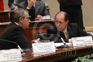 MÉXICO, D.F., 27SEPTIEMBRE2011.- Alfredo Figueroa y Marco Antonio Baños Consejeros Electorales, durante la sesión en la que el pleno por unanimidad aprobó sanciones por 66 millones 539 mil 84 pesos a los siete partidos políticos con representación en el Congreso por irregularidades en sus informes anuales de ingresos y gastos del ejercicio 2010. FOTO: CUARTOSCURO.COM