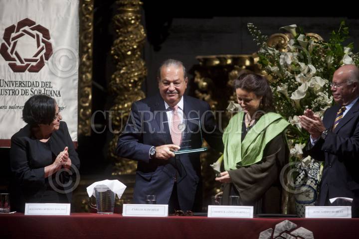 MÉXICO, D.F., 29SEPTIEMBRE2011.- El empresario Carlos Slim, Juan Francisco Ealy, director de El Universal, y Manuel Camacho Solis, durante la ceremonia donde el primero recibió la presa Sor Juana Inés de la Cruz que otorga la Universidad del Claustro de Sor Juana, por los diez años de trabajo que ha realizado al frente del Comité Ejecutivo del Consejo Consultivo para el Rescate del Centro Histórico. En la imagen, a su llegada al recinto educativo. FOTO: ISAAC ESQUIVEL/CUARTOSCURO.COM