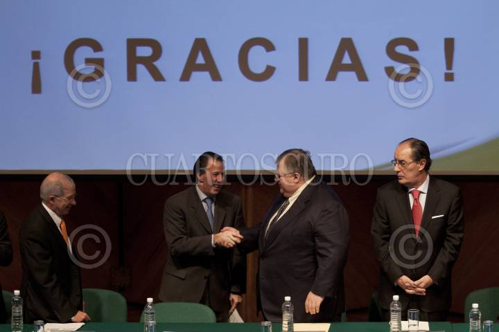 MÉXICO, D.F., 30SEPTIEMBRE2011.- Luis Pazos, Comisión Nacional para la Protección y Defensa de los Usuarios de Servicios Financieros (Condusef), José Antonio Meade Kuribreña, secretario de Hacienda y Crédito Público, Agustín Carstens Carstens, Gobernador del Banco de México y Jaime Ruíz Sacristán, presidente de la Asociación de Bancos de México, durante la inauguración de la semana nacional "Educación Financiera 2011". FOTO: MOISÉS PABLO/CUARTOSCURO.COM
