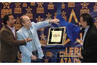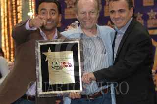 MÉXICO, D.F., 30SEPTIEMBRE2011.- Los actores, Adal Ramones y Juan Carlos Colombo acompañados por el productor de teatro, Gerardo Quiroz, develaron la tarde de hoy la placa “Luminaria de Oro” por el éxito de la obra de teatro “Tiro de Gracia” que se presenta en el Polyforum Cultural Siqueiros. FOTO: FRANCISCO RODRÍGUEZ/CUARTOSCURO.COM