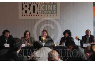 MÉXICO, D.F., 04OCTUBRE2011.- Manuel Gameros, Director General de Estudios Churubusco junto a Guadalupe Ferrer, Directora de la Filmoteca de la UNAM; Marina Stavenhagen, Directora General de IMCINE; Paula Astorga, Directora General de Cineteca Nacional y y Alvaro Hegewisch, Director de la Fonoteca Nacional durante la conferencia de prensa donde anunciaron las actividades que realizaran por los 80 años del cine sonoro en México. FOTO: ENRIQUE ORDÓÑEZ/CUARTOSCURO.COM