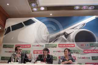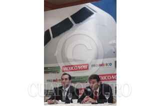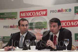 MÉXICO, D.F., 04OCTUBRE2011.- Sergio Ornelas del Bosque, gerente de marketing de Mexico Now, y Luis Olive, jefe de la unidad de promoción de inversiones extranjeras de Proméxico, durante la presentación del Mexico's Aerospace Summit que organiza la revista México Now y que se celebrará del 18 al 20 de este mes en Chihuahua, se espera captar una inversión extranjera que anualmente llega al país suma más de mil mdd. FOTO: MOISÉS PABLO/CUARTOSCURO.COM