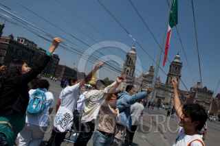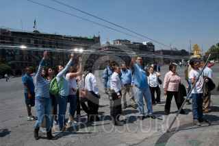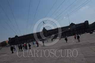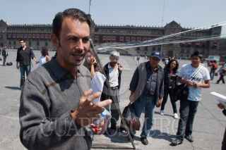 MÉXICO, D.F., 04OCTUBRE2011.- El arquitecto Luciano Matus realizo una instalación efimera con cintas de niquel en la plancha del Zocalo hacia los edificios de gobierno del Distrito Federal. FOTO: RODOLFO ANGULO/CUARTOSCURO.COM