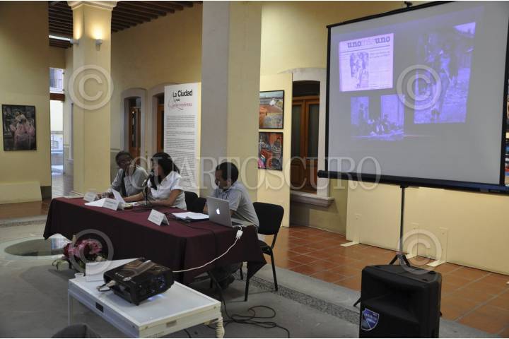 ZACATECAS, ZACATECAS, 07OCTUBRE2011.- La historiadora Mónica Morales Flores (centro), ofreció una conferencia de prensa donde dio pormenores del trabajo de investigación doctoral sobre las imágenes históricas del fotógrafo zacatecano Pedro Valtierra que ha realizado durante su carrera como fotoperiodísta en México y el mundo. Ésto se realizó en la Fototeca de Zacatecas Pedro Valtierra, con la asistencia del legendario fotógrafo y director Pedro Valtierra. FOTO: FRANCISCO SEGURA/CUARTOSCURO.COM