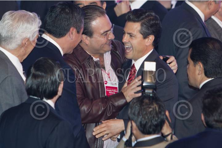 MÉXICO, D.F., 08OCTUBRE2011.- Humberto Moreira, presidente nacional del PRI; Enrique Jackson, secretario técnico y el diputado Francisco Rojas durante una votación en el Consejo Político Nacional del Partido Revolucionario Institucional (PRI), en donde se aprobó que la elección del candidato presidencial sea directa y abierta a militantes y simpatizantes; este evento se realizo en la sede nacional del partido. FOTO: RODOLFO ANGULO/CUARTOSCURO.COM
