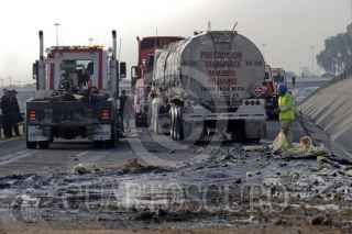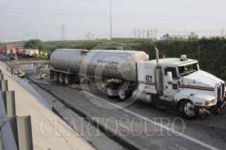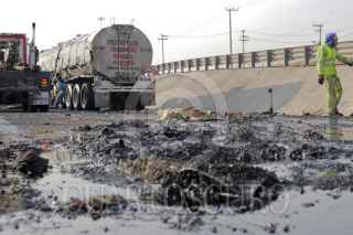 ECATEPEC, ESTADO DE MÉXICO, 08OCTUBRE2011.- Una pipa que transportaba chapopote volcó sobre el Circuito Exterior Mexiquense a la altura de la carretera Lechería Texcoco, perímetro del municipio de Ecatepec. Dicha arteria se mantuvo cerrada por varias horas mientras laboraba personal de Bomberos en la limpieza de la cinta asfáltica. FOTO: LUIS CARBAYO/CUARTOSCURO.COM