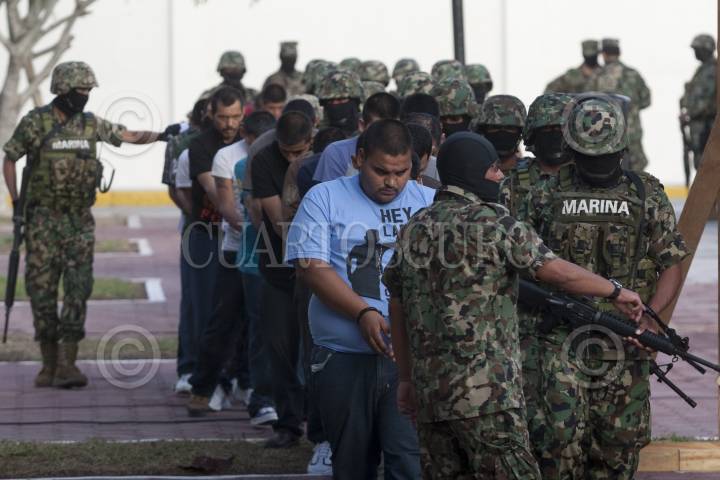 MATAMOROS, TAMAULIPAS., 10OCTUBRE2011.- Elementos de la Secretaria de Marina, realizaron la presentación 36 presuntos delincuentes, entre los que se encontraban, Gabriela Gómez Robles, alias “Gaby” quien es presunta contadora del Cártel del Golfo en Matamoros y a Ricardo Salazar Pequeño, presunto jefe de la plaza del Cártel del Golfo en Miguel Alemán, estos después de varios operativo y enfrentamientos entre el 5 y el de 9 de Octubre, donde fueron se asegurados cuatro toneladas de marihuana seis granadas, 45 lanzagranadas, un cohete RPG, 67 armas largas y cinco cortas, además de 18 mil 221 cartuchos de diversos calibres y vehículos blindados artesanalmente. FOTO: GUILLERMO PEREA/CUARTOSCURO.COM