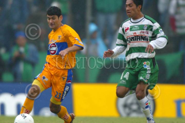 TORREON, COAHUILA14NOVIEMBRE2004.- Irenio Soarez de Tigres envia un centro mientras es marcado por Jorge Campos de Santos en el juego de la jornada 16 en el estadio Corona. FOTO: Jorge López/CUARTOSCURO.COM