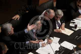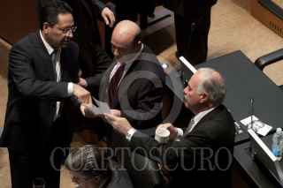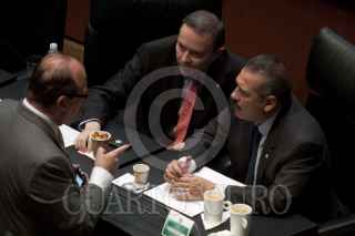 MÉXICO, D.F., 13OCTUBRE2011.- El senador perredista Graco Ramírez, PRD, conversando con los senadores priistas Fernando Castro Trenti, y Manlio Fabio Beltrones, coordinador, durante la discusión en lo particular de la iniciativa de ley reglamentaria del juicio de amparo. FOTO: MOISÉS PABLO/CUARTOSCURO.COM