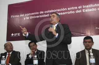 PUEBLA, PUEBLA, 13OCTUBRE2011.- Leonardo Valdés Zurita, consejero presidente del Instituto Federal Electoral (IFE), ofreció una conferencia sobre la histórica del organismo electoral y su importancia en la vida social del país, esto durante la firma de convenio entre el instituto y la Universidad del Desarrollo del Estado de Puebla (UNIDES). FOTO: FRANCISCO GUASCO/CUARTOSCURO.COM