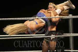 PUEBLA, PUEBLA, 15OCTUBRE2011.- La campeona Beth Phoenix, derrotó a Kelly Kelly, en el encuentro de "divas" del espectáculo de lucha libre estadounidense de la WWE, el cual se presentó en el estadio de béisbol Hermanos Serdán. Cientos de fanáticos pudieron ver a todas las estrellas de la lucha en su categoría RAW. FOTO: FRANCISCO GUASCO/CUARTOSCURO.COM