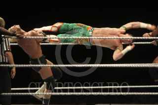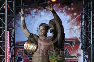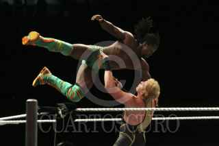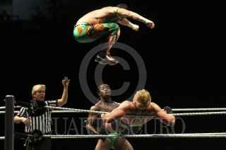 PUEBLA, PUEBLA, 15OCTUBRE2011.- Los campeones Evan Bourne y Kofi Kingstone, se midieron y derrotaron al dueto de Jack Swagger y Dolph Ziggler, durante la función de lucha libre estadounidense de la WWE, que se realizó en el estadio de béisbol Hermanos Serdán. Cientos de fanáticos pudieron ver a todas las estrellas de la lucha en su categoría RAW. FOTO: FRANCISCO GUASCO/CUARTOSCURO.COM