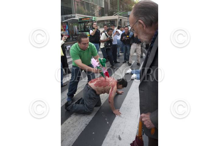 MÉXICO, D.F., 18OCTUBRE2011.- Con un performance simulando la colocación de las banderillas a un toro, simpatizantes del Partido Verde Ecologista de México (PVEM) protestaron en contra de la fiesta taurina en la calle de Madero y Eje Central en el Centra Histórico. FOTO: GUILLERMO PEREA/CUARTOSCURO.COM