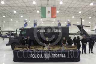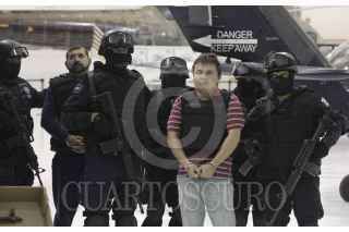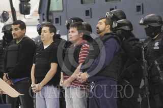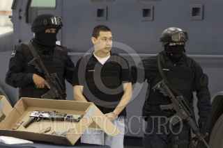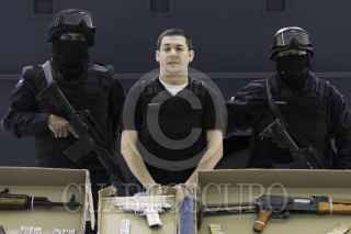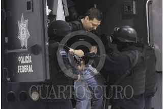 MÉXICO, D.F., 18OCTUBRE2011.- Elementos de la Policía Federal, presentaron en el Centro de Alto Mando de la Policía Federal a Christian Arturo Hernández Tarín, alias "El Cris" lpresunto líder del cártel de "La Barredora". Junto al "Cris" " fueron detenidos José Carlos Espinoza Moreno, alias "El José", de 27 años; Jorge Humberto Silva González, "El Vago", de 30; y José David Sánchez Delgado, "El Loco", de 64. FOTO: SAÚL LÓPEZ/CUARTOSCURO.COM