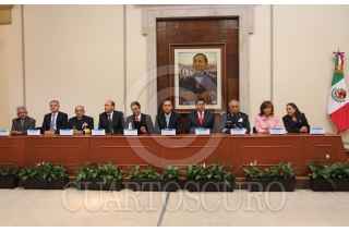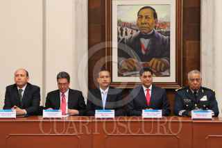MÉXICO, D.F., 20OCTUBRE2011.- Esta mañana, José Francisco Blake Mora, secretario de gobernación; Alejandra Sota, vocera del gobierno federal; el gobernador electo de Coahuila, Rubén Moreira Valdez; y los gobernadores constitucionales Coahuila, Jorge Torres López y Durango, Jorge Herrera Caldera; para hablar sobre el nuevo operativo conjunto de seguridad Laguna Segura. FOTO: CUARTOSCURO.COM