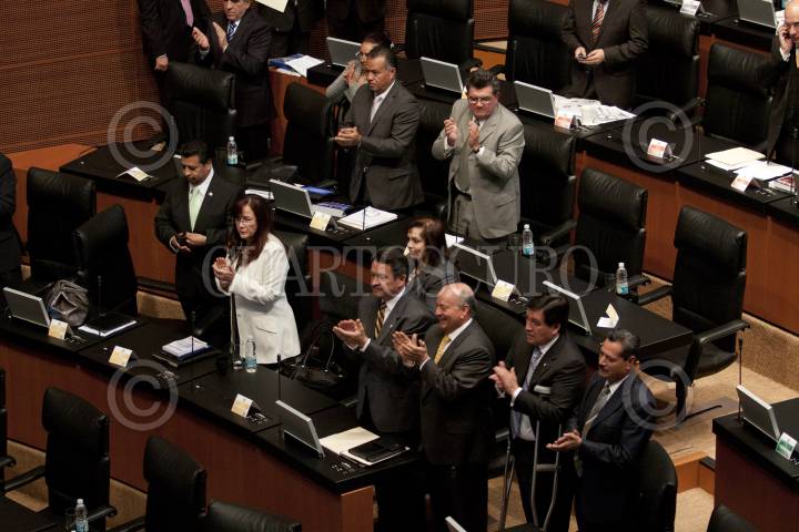 MÉXICO, D.F., 20OCTUBRE2011.- Los senadores Amira Gómez Tueme, PRI, Manlio Fabio Beltrones, coodinador del PRI, Rogelio Rueda Sánchez, PRI, Fernando Castro Trenti, PRI y José González Morfín, presidente de la mesa directiva del Senado, durante la sesión en la que se ratificó la medalla Belisario Domínguez a el Ingeniero Cuauhtémoc Cárdenas. FOTO: MOISÉS PABLO/CUARTOSCURO.COM