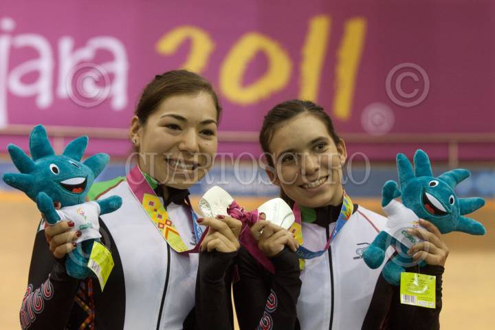 GUADALAJARA, JALISCO, 20OCTUBRE2011.- La ciclista Daniela Gaxiola festeja con el públicla medalla de plata que obtuvo en la competencia de Ciclismo de pista realizado en el Velódromo Panamericano de los Juegos Panamericanos Guadalajara 2011. FOTO: IVÁN STEPHENS/CUARTOSCURO.COM