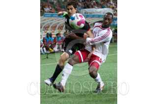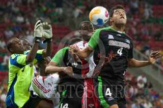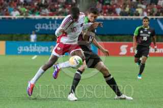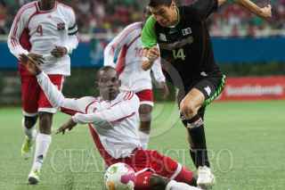 GUADALAJARA, JALISCO, 21OCTUBRE2011.- La selección mexicana de fútbol se enfrenta a su similar de Trinidad y Tobago en los Juegos Panamericanos Guadalajara 2011 donde empató a un gol. Kevin Molino (Trinidad y Tobago) pelea un balón con Jorge Enrique (México) durante el partido. FOTO: IVÁN STEPHENS/CUARTOSCURO.COM
