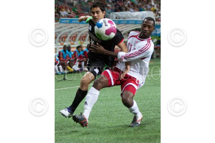 GUADALAJARA, JALISCO, 21OCTUBRE2011.- La selección mexicana de fútbol se enfrenta a su similar de Trinidad y Tobago en los Juegos Panamericanos Guadalajara 2011 donde empató a un gol. Kevin Molino (Trinidad y Tobago) pelea un balón con Jorge Enrique (México) durante el partido. FOTO: IVÁN STEPHENS/CUARTOSCURO.COM