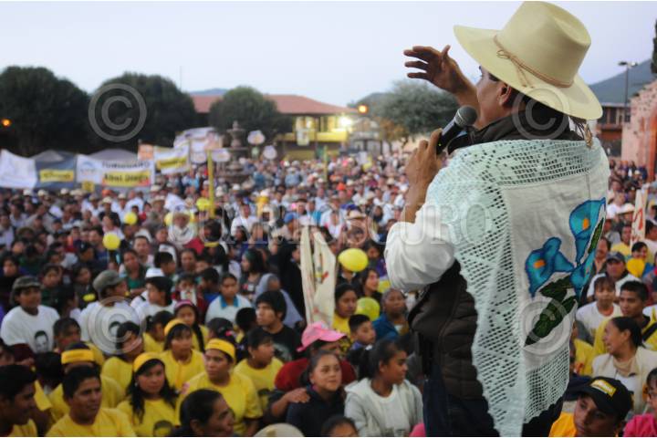 NAHUATZEN, MICHOACÁN, 22OCTUBRE2001.- Después de visitar Tazintaro lo cual hizo en helicóptero, el candidato del Partido de la Revolución Democrática a la gubernatura del estado, Silvano Aureoles Conejo visitó esta comunidad purépecha donde dirigió un mensaje a la población que se encontraba reunida en el centro de este poblado. FOTO: FRANCISCO RODRÍGUEZ/CUARTOSCURO.COM