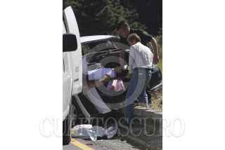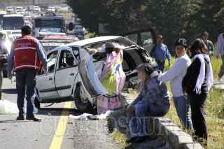 LA MARQUESA, ESTADO DE MÉXICO., 23OCTUBRE2011.- Un choque entre un chevy color blanco y un autobús de pasajeros dejo como saldo dos personas muertas, entre ellas una menor de edad. Los pasajeros del vehículo compacto formaban parte de una peregrinación de taxistas que se dirigía a Chalma, los hechos ocurrieron en el kilómetro 33 de la autopista México Toluca, a la altura de la marquesa. FOTO: LUIS CARBAYO/CUARTOSCURO.COM