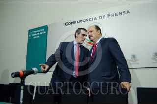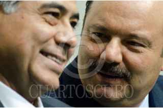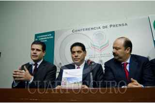 MÉXICO, D.F., 25OCTUBRE2011.- Miguel Alonso Reyes y Jorge Herrera Caldera, gobernadores de Zacatecas y Durango, respectivamente, durante una conferencia de prensa donde denunciaron la grave crísis del campo mexicano en el norte del país. FOTO: MISAEL VALTIERRA/CUARTOSCURO.COM