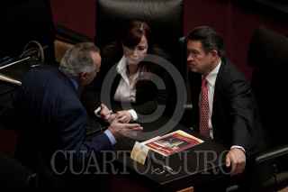 MÉXICO, D.F., 25OCTUBRE2011.- Los perredistas Yeidckol Polevnsky, y Carlos Navarrete, coordinador, conversan con el panista Ernesto Saro Boardman, durante la sesión en la Cámara de Senadores. FOTOS: MOISÉS PABLO/CUARTOSCURO.COM