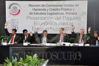 MÉXICO, D.F., 26OCTUBRE2011.- Los senadores Angel Díaz Caneja, Tomás Torres, José Isabel Trejo, Rogelio Rueda, y Javier Castelo Parada, durante una votación en la reunión de Comisiones Unidas de Hacienda y Crédito Público para el análisis del Paquete Económico para el Ejercicio Fiscal 2012. FOTO: CUARTOSCURO.COM