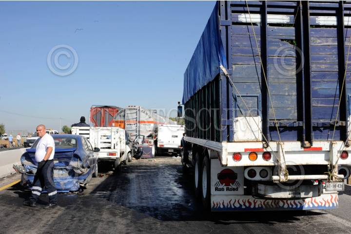 TULTEPEC, ESTADO DE MÉXICO, 29OCTUBRE2011.- Un sujeto perdió la vida aplastado en su auto en la carambola que se registro en Circuito Exterior Mexiquense a la altura del Km. 19 en Municipio de Tultepec, en el incidente participaron mas de 50 vehículos; trailers, autos particulares, policíacos y militares. FOTO: LUIS CARBAYO/CUARTOSCURO.COM