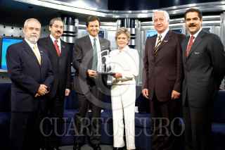 MEXICO, D.F. 26NOVIEMBRE2004.- Durante la realización del Décimo Noveno Día de Movimiento Azteca, en apoyo a la Fundación Michou y Mau, la meta de 5 millones de pesos fue superada, lográndose recaudar la cantidad de $10’ 508,000.00. En la imagen Natividad González, Gobernador de Nuevo León; Esteban Moctezuma, Virginia Sendel, Marcelo de Los Santos y Javier Alatorre. FOTO: CUARTOSCURO.COM