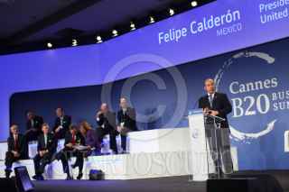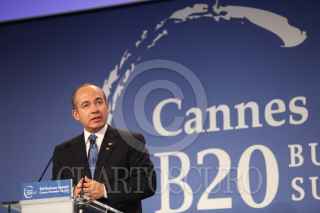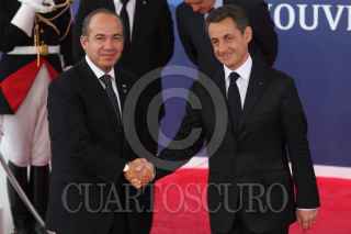 CANNES, FRANCIA, 03NOVIEMBRE2011.- Felipe Calderón Hinojosa, presidente de México, es recibido por su homólogo francés, Nicolas Sarkozy, durante su llegada al almuerzo de trabajo al inicio de la cumbre de líderes del G20, en el palacio de los Festivales en Cannes. FOTO: ALFREDO GUERRERO/CUARTOSCURO.COM