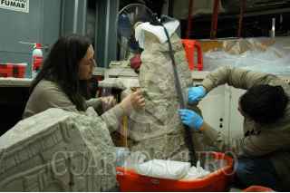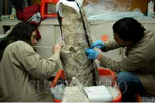 EL TAJÍN, VERACRUZ, 03NOVIEMBRE2011.- Dos tableros de piedra de grandes dimensiones, cada uno de media tonelada de peso y más de 1,000 años de antigüedad, son restaurados por especialistas del Instituto Nacional de Antropología e Historia (INAH), para frenar el deterioro que han sufrido a lo largo del tiempo, darles estabilidad y asegurar su permanencia. Los monolitos que datan de 600 a 900 d.C., tienen grabados un personaje sobrenatural y una decapitación ritual. FOTO: INAH/CUARTOSCURO.COM