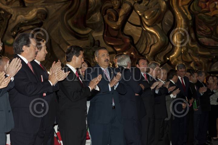 MÉXICO, D.F., 03NOVIEMBRE2011.- Los priistas Manlio Fabio Beltrones, coordinador de los senadores, Cristina Díaz, secretaria general del PRI, Humberto Moreira, dirigente nacional del PRI, y Marco Antonio Bernal, presidente de la Fundación Colosio, durante el "Foro Nacional de Conclusiones, Programa para México", impulsado por la Fundación Colosio, y el cual se realizó en Polyforum Cultural Siqueiros FOTO: MOISÉS PABLO/CUARTOSCURO.COM