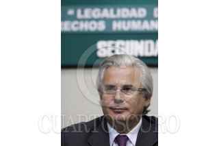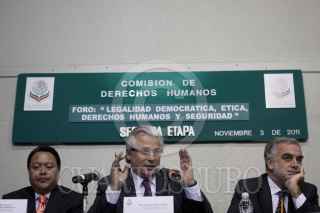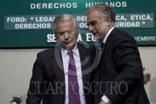MÉXICO, D.F., 03NOVIEMBRE2011.- El juez español Baltasar Garzón, y Luis Moreno Ocampo, fiscal jefe del Tribunal Penal Internacional (TPI), al finalizar el foro "Legalidad democrática, ética, derechos humanos y seguridad", en la Cámara de Diputados. FOTO: MOISÉS PABLO/CUARTOSCURO.COM