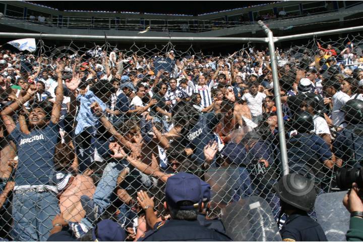 PACHUCA, HIDALGO 28NOVIEMBRE2004.- La afición de los Rayados del Monterrey festejan el gol que Guille Franco anoto al Pachuca en el partido de vuelta de los Cuartos de Final. FOTO: Nelly Salas/CUARTOSCURO.COM