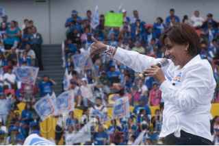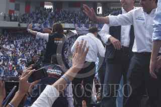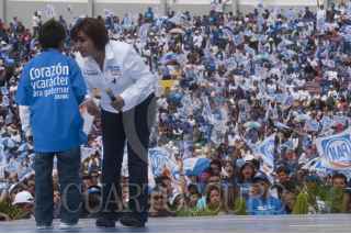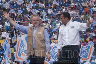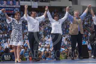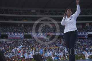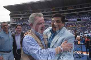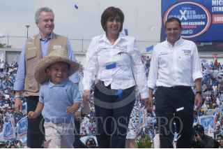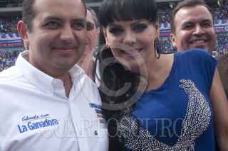 MORELIA, MICHOACÁN, 06NOVIEMBRE2011.- El precandidato presidencial por el Partido Acción Nacional, Ernesto Cordero se "tomó" la foto con la conductora Maribel Guardia al finalizar el cierre de campaña de Luisa María Calderón Hinojosa la tarde de hoy en el estadio Morelos en vísperas de las elecciones a la gubernatura el próximo domingo 13 de Noviembre. FOTO: FRANCISCO RODRÍGUEZ/CUARTOSCURO.COM