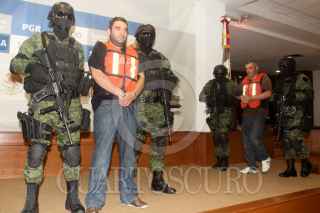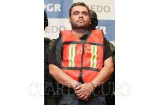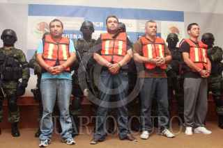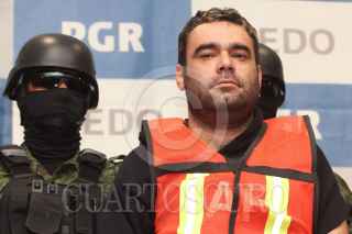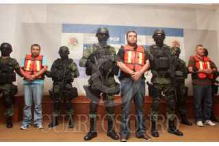 MÉXICO, D.F., 07NOVIEMBRE2011.- Personal de la Secretaria de la Defensa Nacional y de la Procuraduría General de la República, presentaron ante los medios de comunicación a Francisco Sillas Rochas alias el "Sillas" o el "Rueda" identificado como presunto lugarteniente de Fernando Sánchez Arellano alias "El Ingeniero". Junto con Juan Francisco Sillas, fueron detenidos tres personas más identificados como Lorenzo Ramírez Aispuro, Alejandro Sotelo Pineda y Cristian Ezequiel Sotelo. FOTO: SAÚL LÓPEZ/CUARTOSCURO.COM