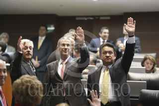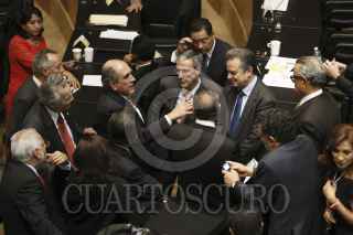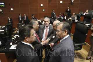 MÉXICO, D.F., 08NOVIEMBRE2011.- Los senadores Carlos Navarrete, coordinador perredista, Manlio Fabio Beltrones, coordinador priista, José González Morfín, presidente de la mesa directiva, Jesús Murillo Karam, PRI, y Heladio Ramírez López, PRI, durante la sesión en la Cámara de Senadores. FOTO: CUARTOSCURO.COM