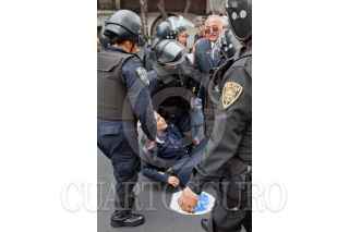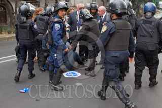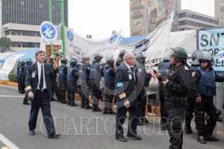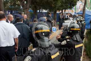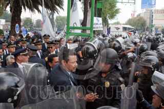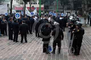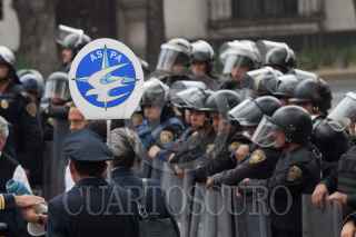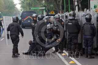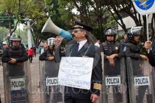 MÉXICO, D.F., 09NOVIEMBRE2011.- Integrantes de la Asociación Sindical de Pilotos Aviadores de México fueron replegados por los granaderos de la Secretaría de Seguridad Pública, cuando bloqueaban el cruce de las avenidas Eje Central y Xola en las inmediaciones de la Secretaría de Comunicaciones y Tranpsortes, los pilotos que pertenecen a la empresa Mexicana de Aviación se manifestaban por una solución a su situación laboral, ya que dicha compañía permanece sin actividades por falta de solvencia. El día de ayer se anunció que un grupo de empresario están dispuestos a inyectarles a la compañía cerca de 400 millones de dólares. FOTO: MOISÉS PABLO/CUARTOSCURO.COM