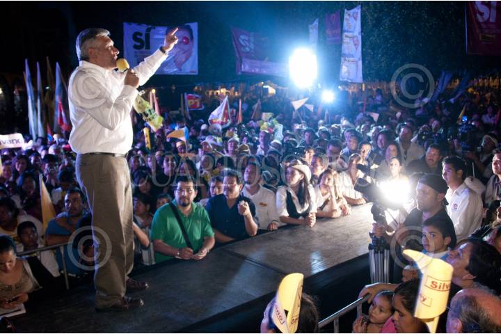 ZAMORA, MICHOACÁN, 09NOVIEMBRE2011.- El precandidato del PRD y dirigente de MORENA, Andrés Manuel López Obrador acudió la noche de hoy al cierre de campaña del candidato del PRD, PT, Convergencia Silvano Aureoles a la gubernatura del estado en el último día de campaña antes de la veda electoral y las elecciones el próximo 13 de Noviembre. FOTO: FRANCISCO RODRÍGUEZ/CUARTOSCURO.COM