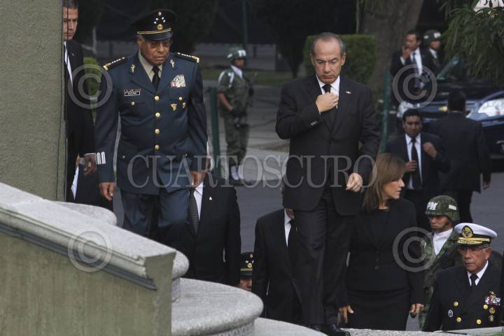 MÉXICO, D.F., 12NOVIEMBRE2011.- Felipe Calderón Hinojosa, presidente de México acompañado de su esposa Margarita Zavala, coordinadores del Senado de la República, Cámara de Diputados, secretarios de estado, gobernadores, funcionarios y familiares de José Francisco Blake Mora, Secretario de Gobernación y a sus siete asistentes, les rindieron un homenaje de estado en el campo militar Marte después que perdieran la vida el día de ayer al desplomarse el helicóptero en el que viajaban en la zona montañosa de Chalco. FOTO: SAÚL LÓPEZ/CUARTOSCURO.COM