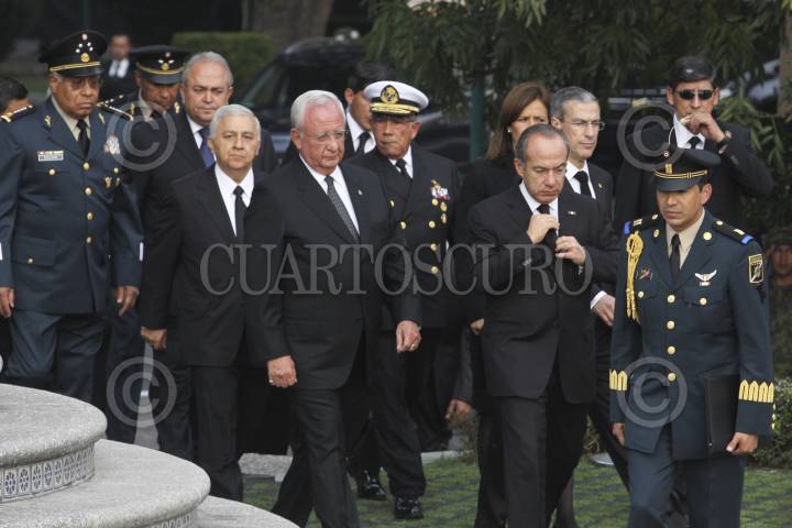 MÉXICO, D.F., 12NOVIEMBRE2011.- Felipe Calderón Hinojosa, presidente de México acompañado de su esposa Margarita Zavala, coordinadores del Senado de la República, Cámara de Diputados, secretarios de estado, gobernadores, funcionarios y familiares de José Francisco Blake Mora, Secretario de Gobernación y a sus siete asistentes, les rindieron un homenaje de estado en el campo militar Marte después que perdieran la vida el día de ayer al desplomarse el helicóptero en el que viajaban en la zona montañosa de Chalco. FOTO: SAÚL LÓPEZ/CUARTOSCURO.COM