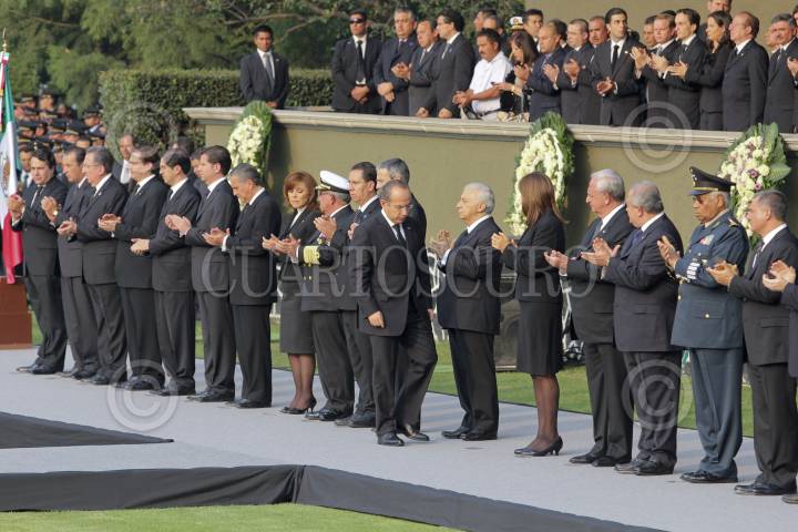 MÉXICO, D.F., 12NOVIEMBRE2011.- Felipe Calderón Hinojosa, presidente de México acompañado de su esposa Margarita Zavala, coordinadores del Senado de la República, Cámara de Diputados, secretarios de estado, gobernadores, funcionarios y familiares de José Francisco Blake Mora, Secretario de Gobernación y a sus siete asistentes, les rindieron un homenaje de estado en el campo militar Marte después que perdieran la vida el día de ayer al desplomarse el helicóptero en el que viajaban en la zona montañosa de Chalco. FOTO: SAÚL LÓPEZ/CUARTOSCURO.COM