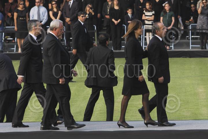 MÉXICO, D.F., 12NOVIEMBRE2011.- Felipe Calderón Hinojosa, presidente de México acompañado de su esposa Margarita Zavala, coordinadores del Senado de la República, Cámara de Diputados, secretarios de estado, gobernadores, funcionarios y familiares de José Francisco Blake Mora, Secretario de Gobernación y a sus siete asistentes, les rindieron un homenaje de estado en el campo militar Marte después que perdieran la vida el día de ayer al desplomarse el helicóptero en el que viajaban en la zona montañosa de Chalco. FOTO: SAÚL LÓPEZ/CUARTOSCURO.COM
