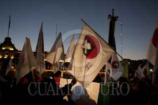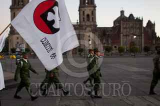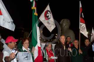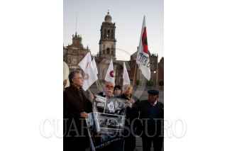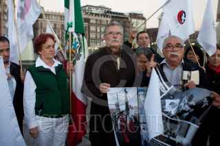 MÉXICO, D.F., 15NOVIEMBRE2011.- Los líderes estudiantiles Ana Ignacio Rodríguez, Félix Hernández Gamundi, y Raúl Álvarez Garín, leyeron un comunicado en el que exigen se publique en el Diario Oficial de la Federación la decisión de la Cámara de Diputados de declarar el 2 de octubre como "Día de duelo nacional y homenaje a los caídos en la lucha por la democracia", lo que significa que es esa fecha la bandera nacional será izada a media asta. Los dirigentes del comité del 68 tenían planeado acompañar la ceremonia de izamiento que se realiza en el Zócalo a las 5:45 a.m., con banderas del movimiento, pero se encontraron que el lábaro patrio ya había sido desplegado por los militares. FOTO: MOISÉS PABLO/CUARTOSCURO.COM