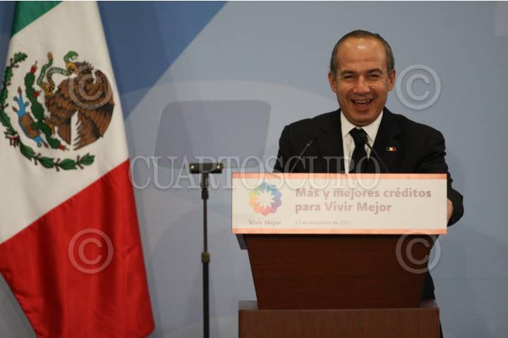 MÉXICO, D.F., 17NOVIEMBRE2011.- Felipe Calderón Hinojosa, Presidente de México, encabezó el evento "Entrega del crédito 6 millones del Fondo Nacional para el Consumo de los Trabajadores", en el salón Adolfo López Mateos de Los Pinos. FOTO: MOISÉS PABLO/CUARTOSCURO.COM