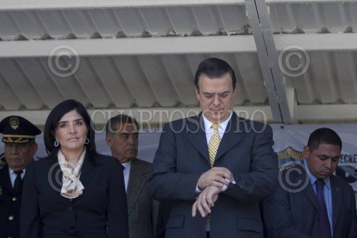 MÉXICO, D.F., 18NOVIEMBRE2011.- Marcelo Ebrard Casaubón, Jefe de Gobierno, entregó equipo a elementos de la Policía Bancaria e Industrial, en el marco de la celebración de su 70 aniversario de creación, en la explanada de la Ciudad Deportiva. FOTO: MOISÉS PABLO/CUARTOSCURO.COM