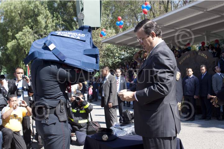 MÉXICO, D.F., 18NOVIEMBRE2011.- Marcelo Ebrard Casaubón, Jefe de Gobierno, entregó equipo a elementos de la Policía Bancaria e Industrial, en el marco de la celebración de su 70 aniversario de creación, en la explanada de la Ciudad Deportiva. FOTO: MOISÉS PABLO/CUARTOSCURO.COM